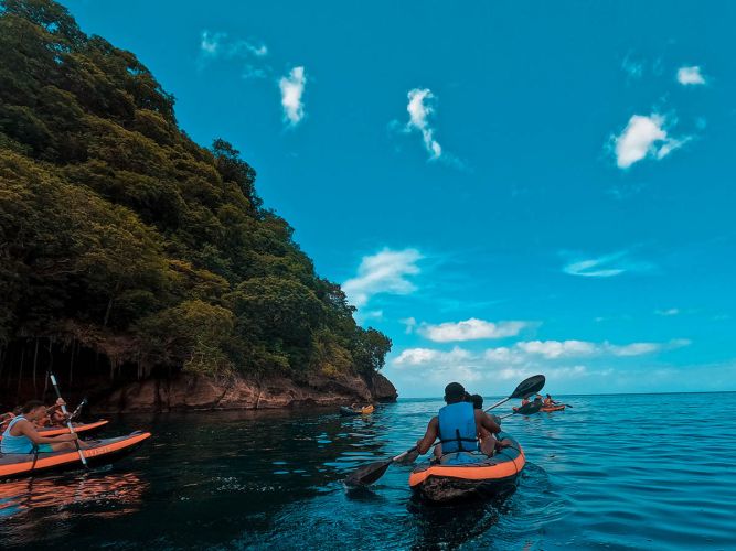 Your day begins at the Kingstown port, where our friendly guides will greet you. We'll take you along the picturesque Leeward Coast, heading towards the Buccament Bay. Here, kayaks await to take you on an unforgettable journey to Petit Byahaut. As you paddle, keep an eye out for the diverse marine life (beautiful reefs) and enjoy the stunning coastal views.